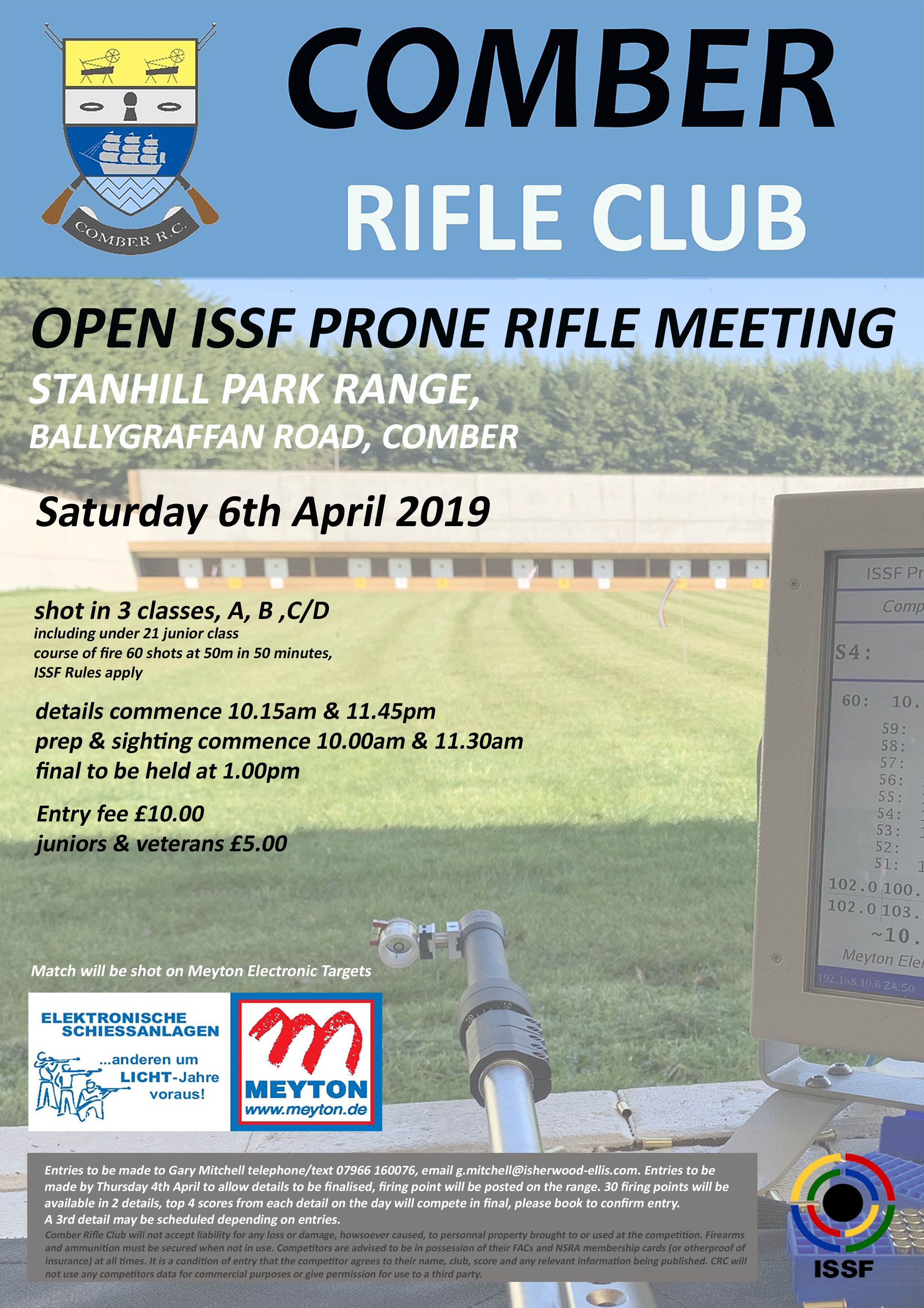 Comber Rifle Club will host an ISSF Open Prone Rifle match on Saturday 6th April 2019 at the Stan Hill Range Complex.