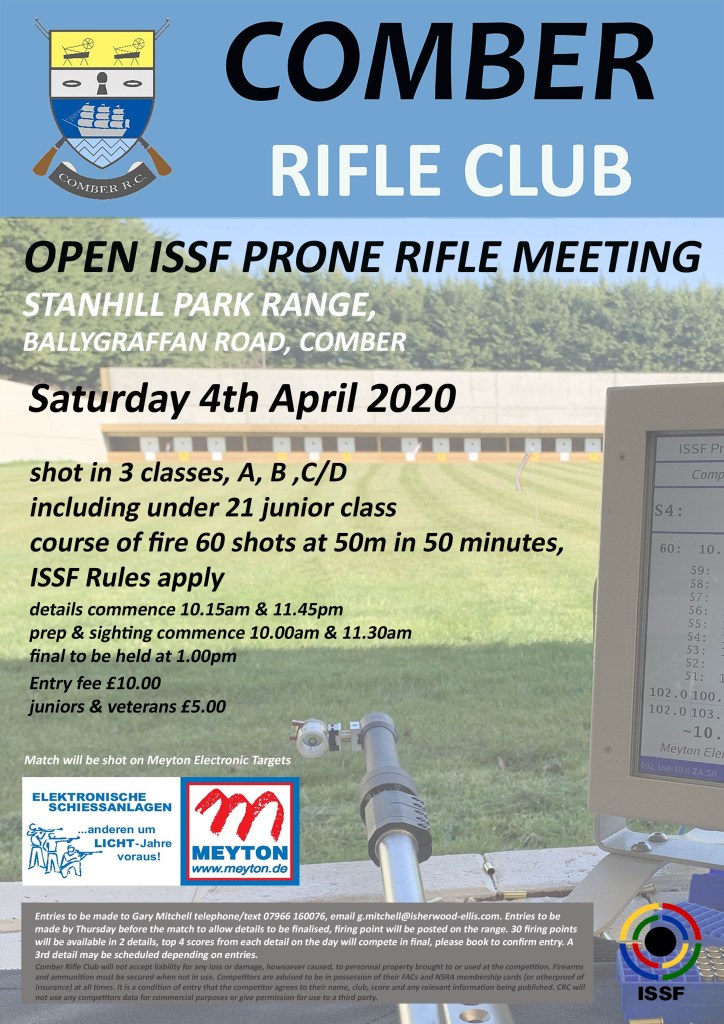 Comber ISSF Open Prone Meeting 4 April 2020 March 9, 2020 / Colin Entries are now open for the Comber ISSF Open Prone meeting to be held on 4th April 2020. Details are in the poster below Share this: Click to share on Facebook (Opens in new window) Facebook Click to share on X (Opens in new window) X Click to share on WhatsApp (Opens in new window) WhatsApp Related